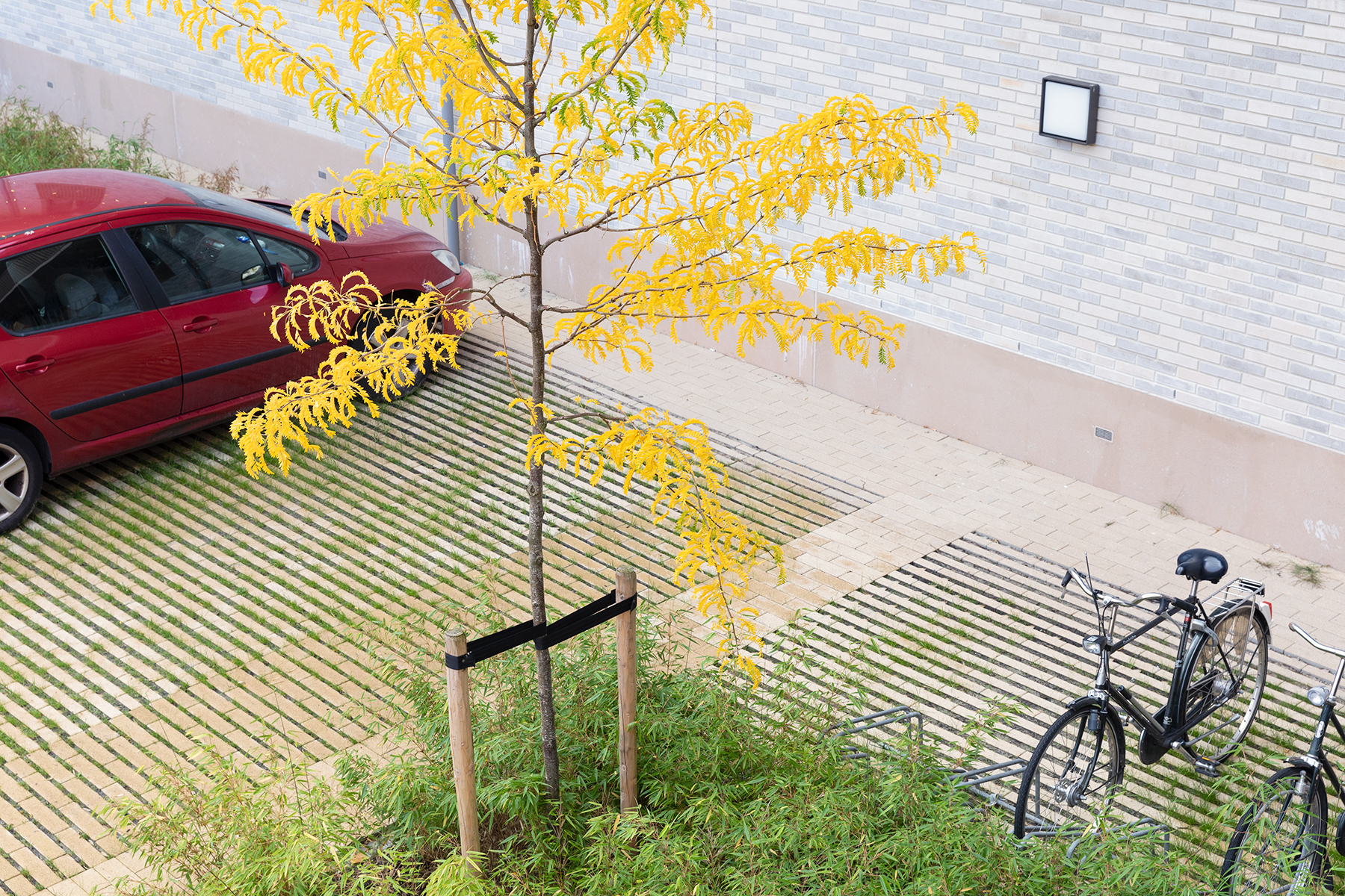 Uiteraard moet de ruimte klimaat adaptief zijn en de biodiversiteit versterken. Mooi meegenomen: hittestress voorkomen, steeds belangrijker in een warmer wordende stad. Lastig. De bouwblokken rondom de binnenplaats worden immers meestal hoog, zelfs in de winter is het er redelijk warm. Dan hebben we het effect van de reflecterende zon op alle voertuigen in de zomer, nog niet eens genoemd.