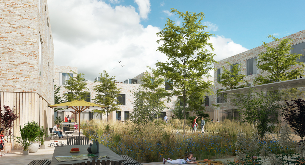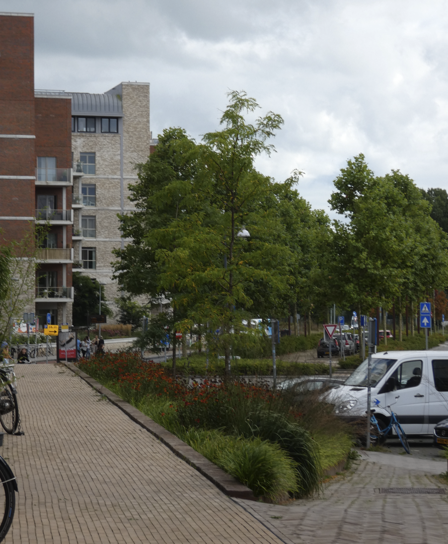 De stoepjes worden omzoomd door plantvakken beplant met weelderige bloeiende beplanting, bollen, wintergroen, struiken en bomen. Het hart van de ruimte blijft open en vormt een pleintje voor de bewoners.
