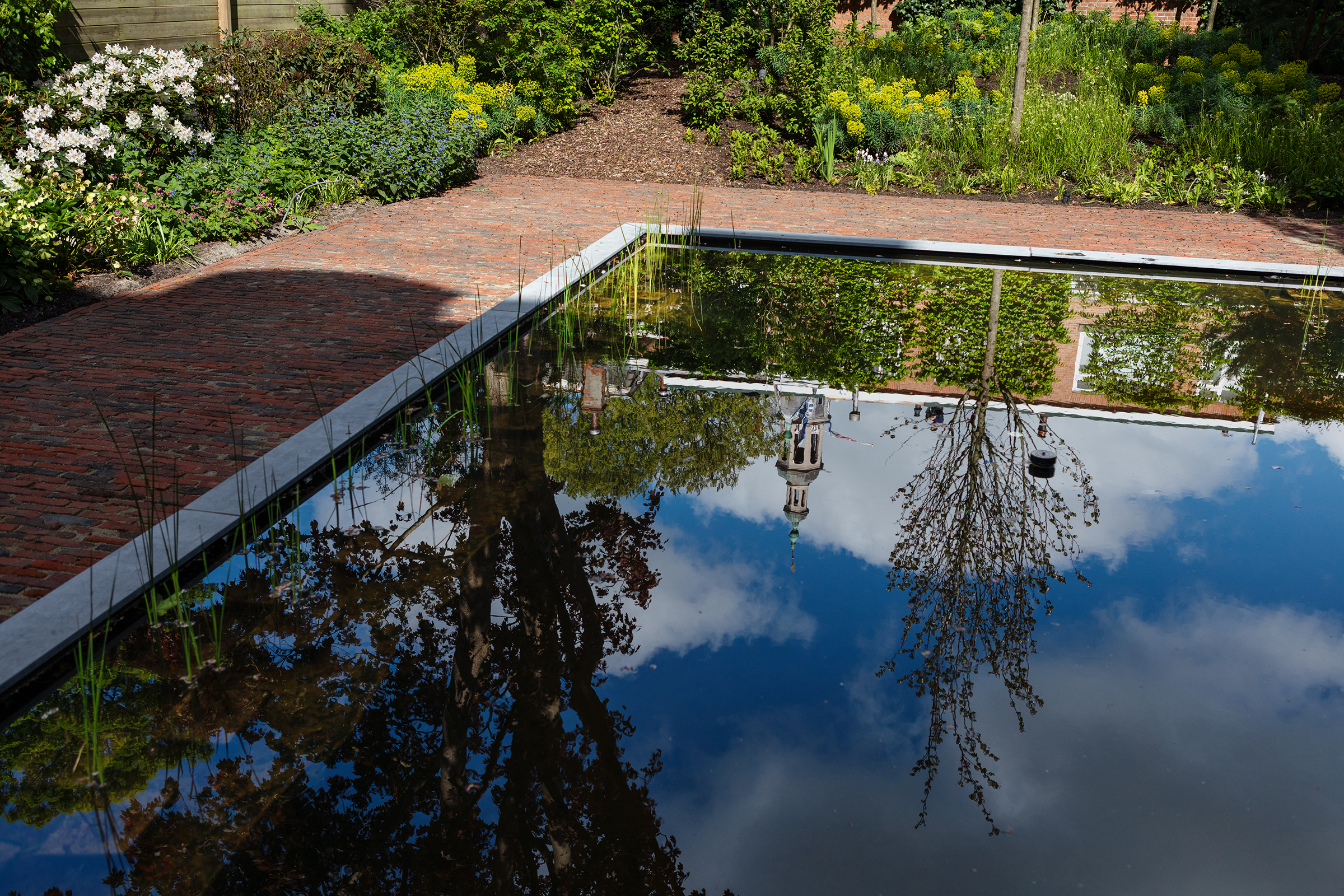 De tuin, van het herenhuis uit 1722 is weer in ere hersteld. De sfeervolle oude bomen zijn blijven staan, op een 130 jaar oude beuk na. Die moest worden gekapt. Hanne van der Velde, onze vaste fotograaf mocht mee naar boven. Dat leverde, ondanks de trillende benen, mooie plaatjes op. Kijk maar eens onderaan deze pagina.