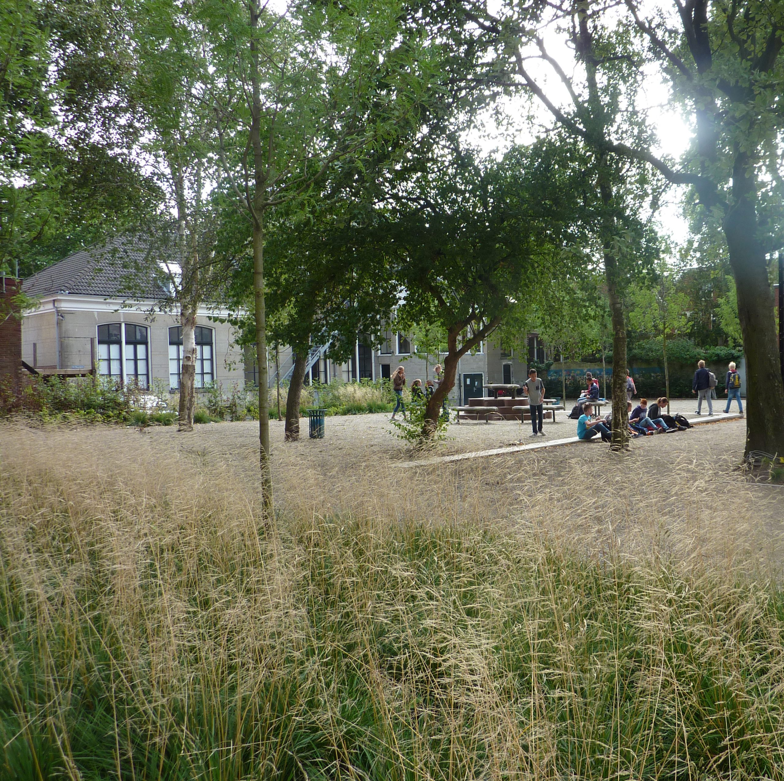 Het Stadslyceum zit in de oude binnenstad van Groningen. Maar door het traditionele 'schoolplein' in te richten als een soort groene brink, komt er een heel andere sfeer. Dat zit hem in het groen, en ook in bijvoorbeeld de akoestiek die heel anders wordt door de ondergrond van een soort zand.