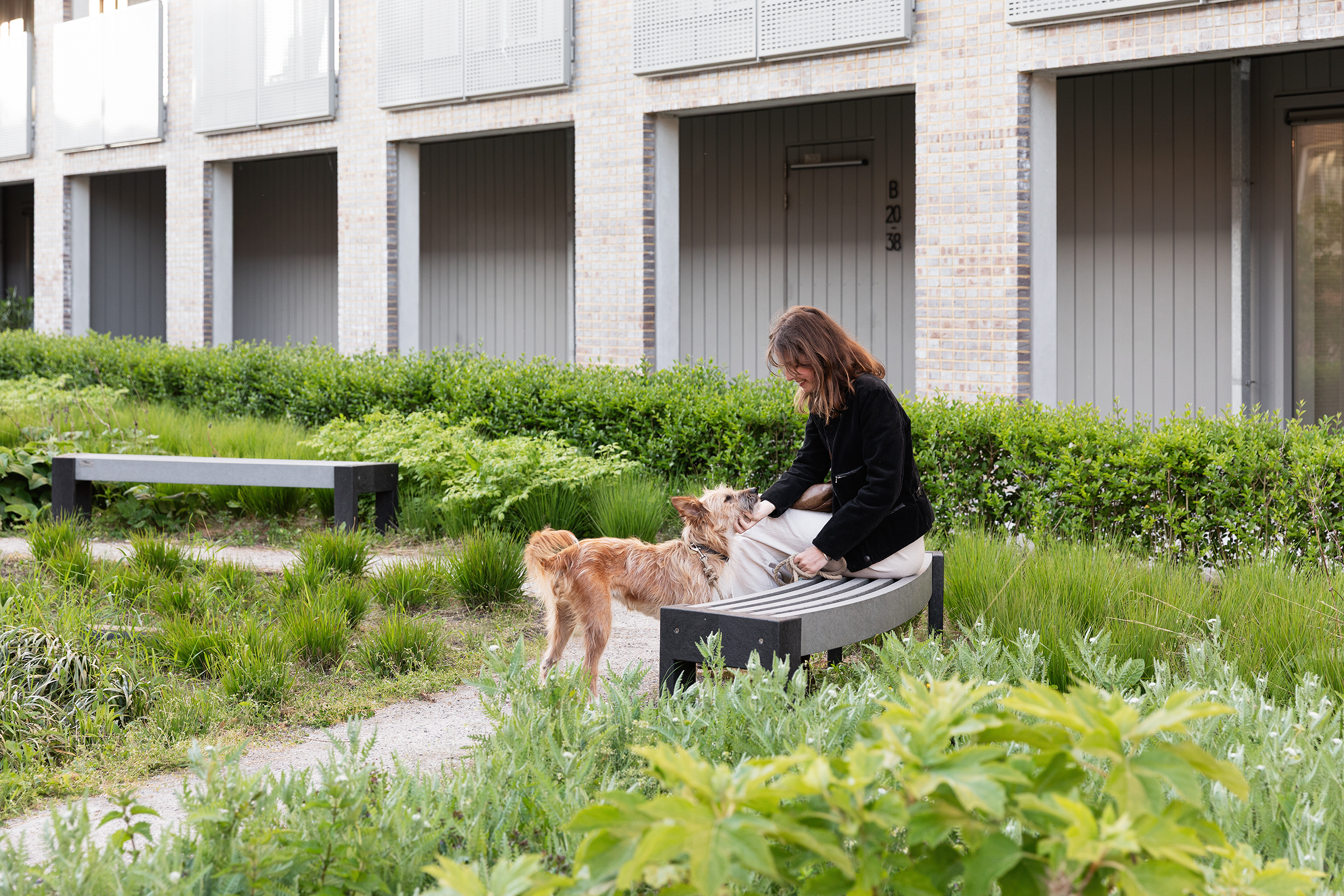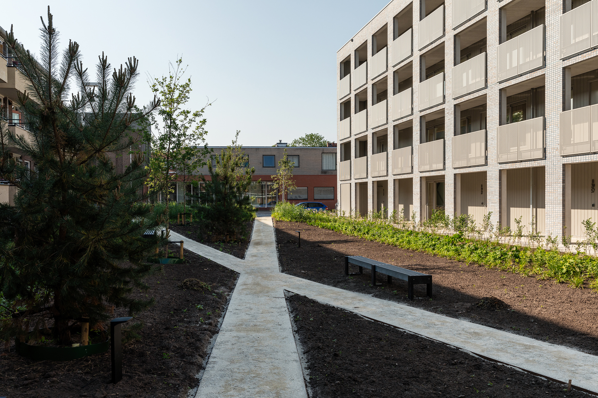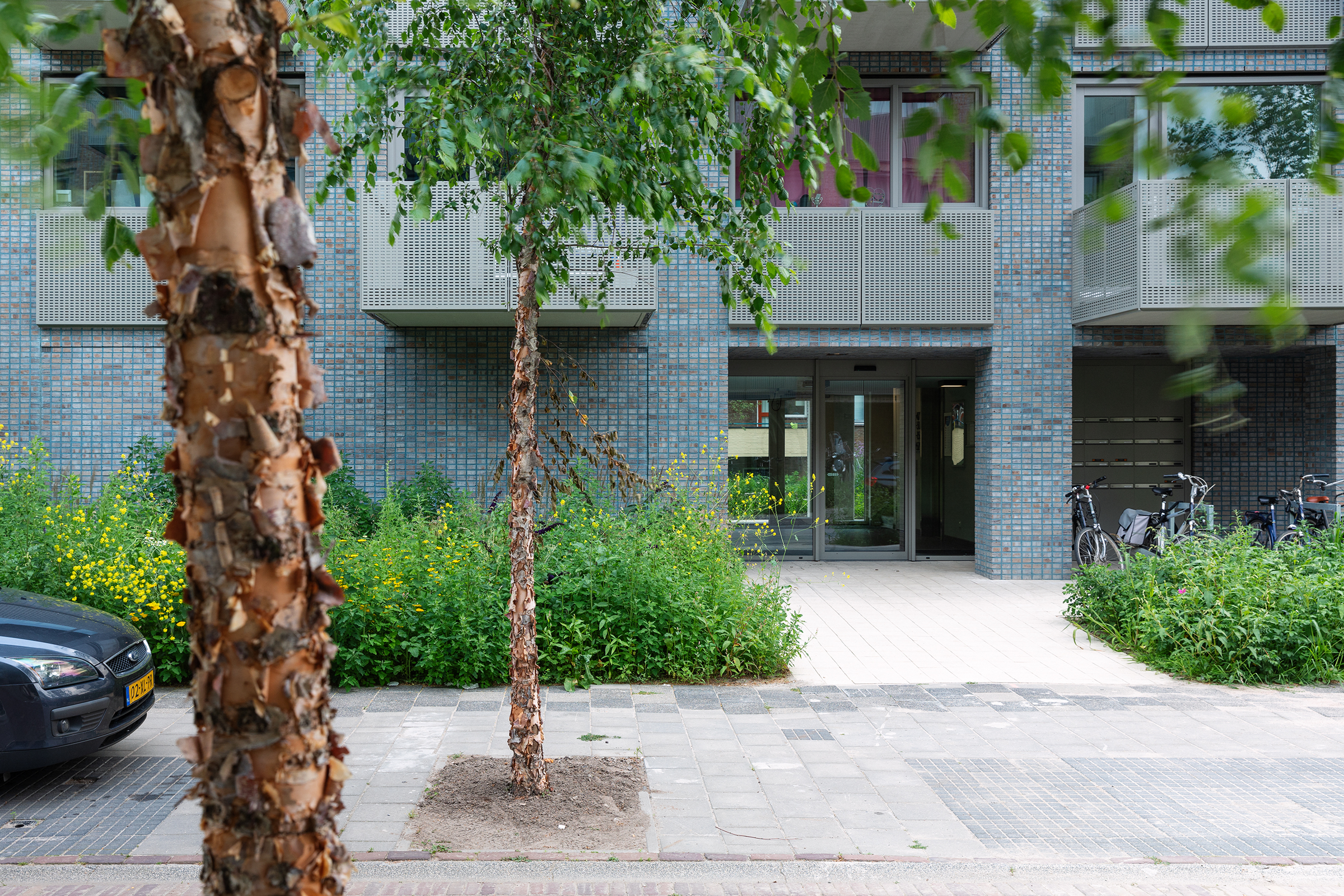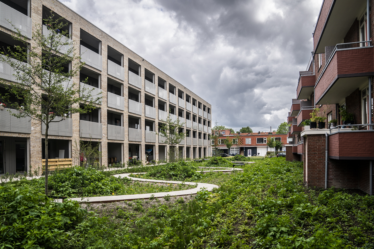 De subtiele hoogte verschillen zorgen voor spanning, waterberging en versterken de biodiversiteit. Naast een ruige weide met wadi zijn de gemeenschappelijke binnentuinen en de voortuinen volledig beplant met (inheemse) bladplanten, vaste planten, bomen, struiken en bollen en bestaat volledig uit klimaatbestendige beplanting.