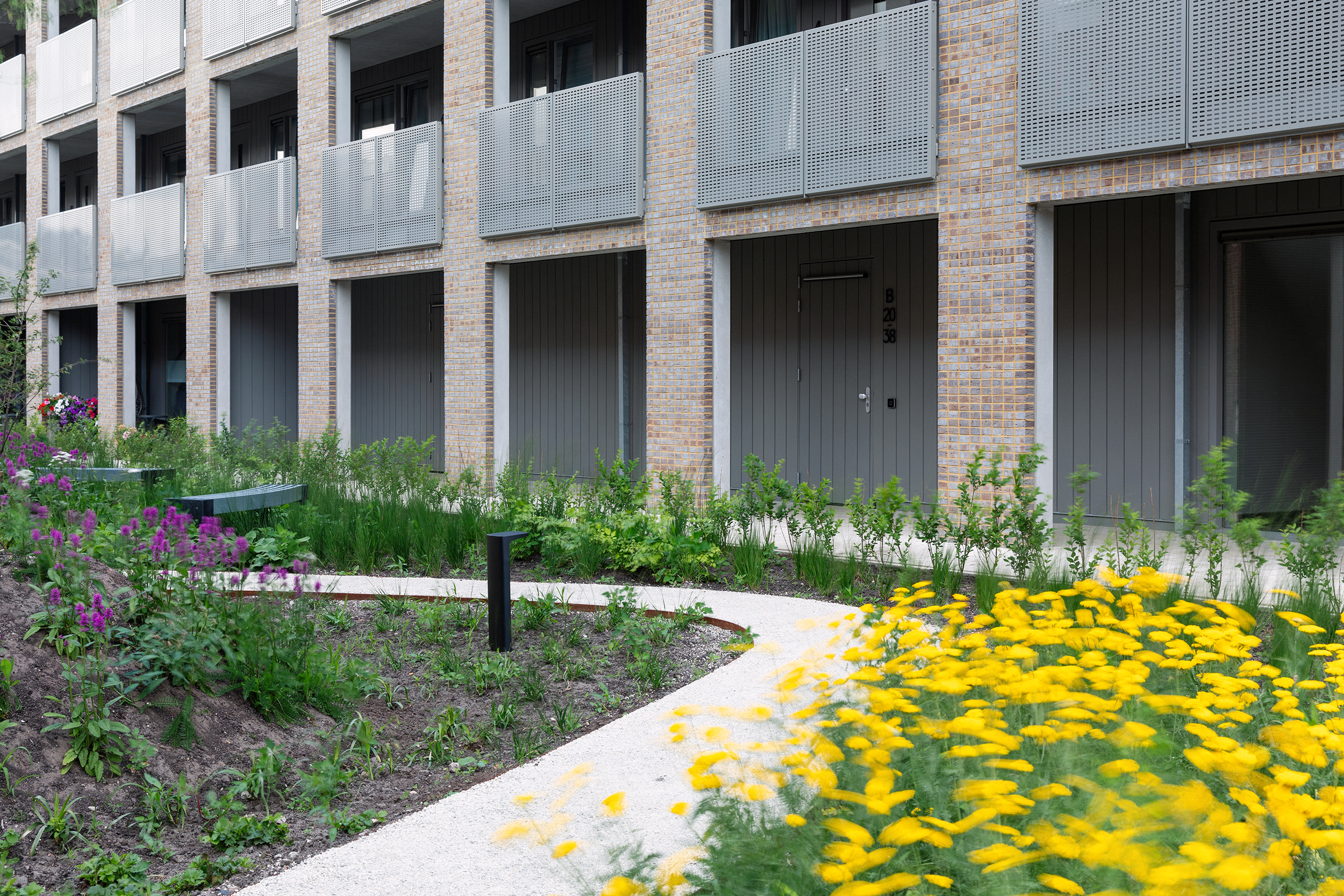 Het beplantingsplan is gelaagd, naast het vormgevende aspect (schilderen met planten) wordt de beplanting ingezet om: het geluid te absorberen, de privacy van de bewoners te versterken, biodiversiteit te creëren, water te bergen en de bewoners, letterlijk, in het groen te zetten.